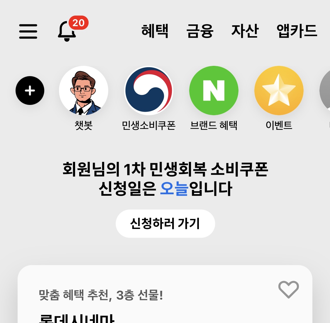 체크카드 또는 신용카드로 지원금을 받으실 분들은 해당 카드 앱이나 사이트에 먼저 접속해 줍니다. 카드사에서 대부분 메인 화면에 민생회복 소비쿠폰 신청으로 띄어 놓았을 거예요. 만약 안뜬다면 검색을 하시면 나올 거예요.