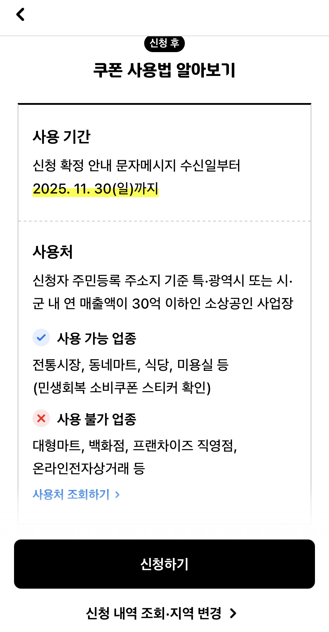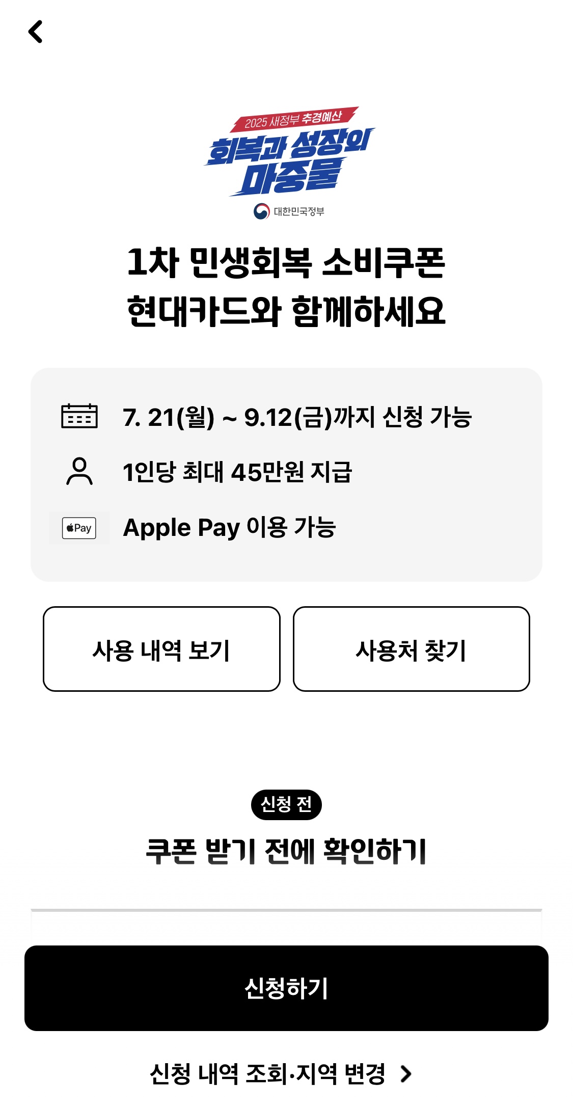2. 신청 전 사용처, 사용기간 등 확인 후 신청하기 버튼 클릭!