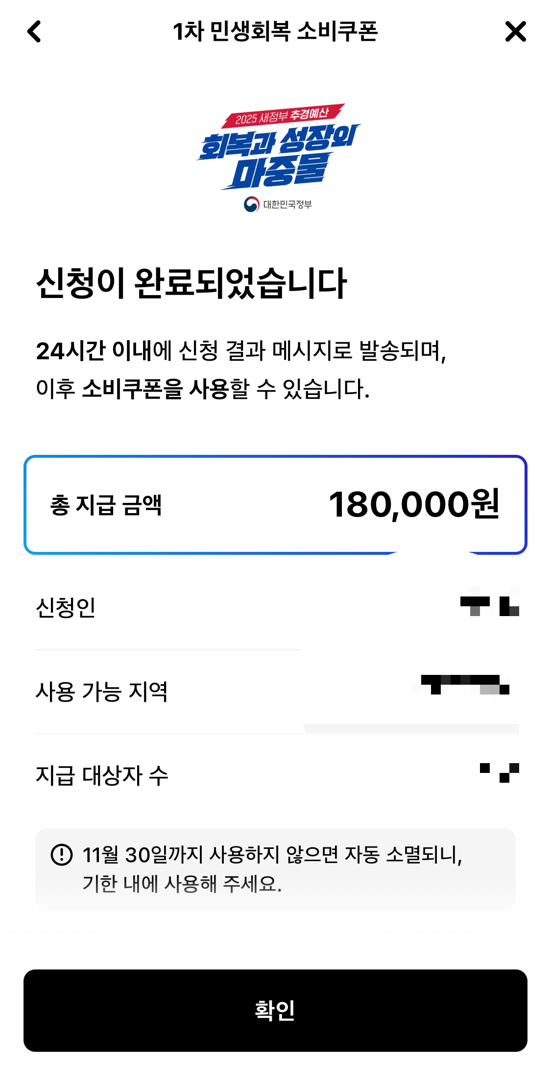 본인 인증만 완료하고 나면 신청인, 생년월일, 사용가능지역, 지급대상수가 자동으로 작성되어 조회가 됩니다. 해당 정보를 확인한 후 신청완료 버튼까지 눌러주면 신청이 끝납니다.