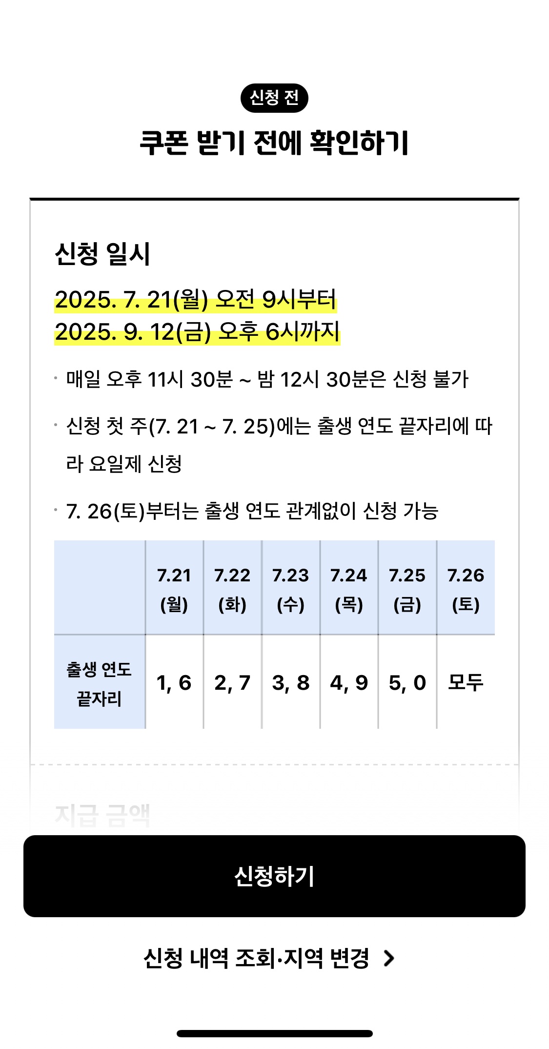 안녕하세요~ 오늘, 21일 9시부터 민생회복 소비쿠폰 신청이 시작되었습니다. 사람이 몰리는 것을 대비해 첫 째주는 출생연도 끝자리를 기준으로 요일제로 신청을 합니다. 따라서 오늘은 끝자리 1,6인 국민들만 신청이 가능합니다. 전 1996년생이라서 오늘 9시 땡 되자마자 바로 신청을 해봤어요~