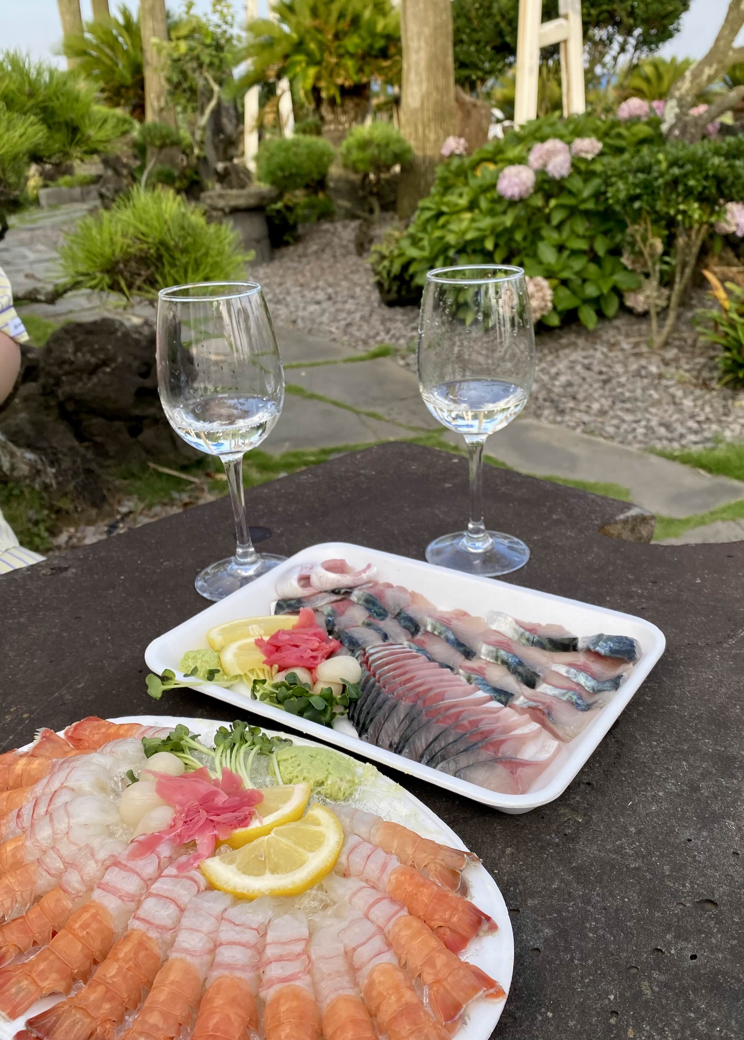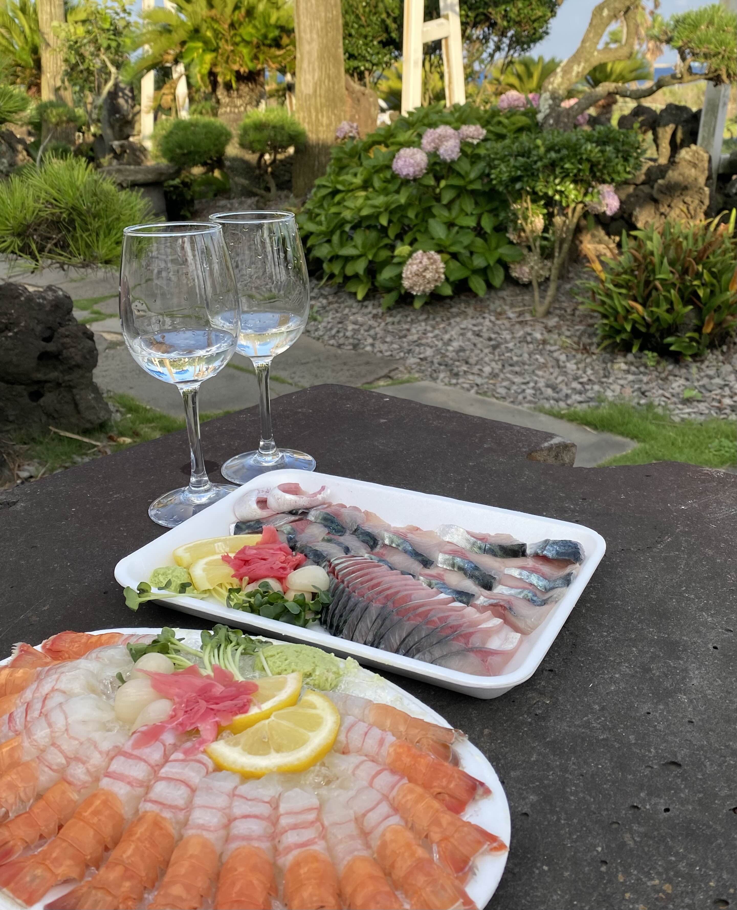 회도 맛있고 바다 + 성산일출봉 보면서 먹으니까 더욱더 맛있었어요. 와인잔에 한라산 따라 마시면서 제주 여행 마지막 날을 한 껏 즐겼답니다. 전 야외에서 회 먹은 게 가장 기억에 남고 좋았어요!