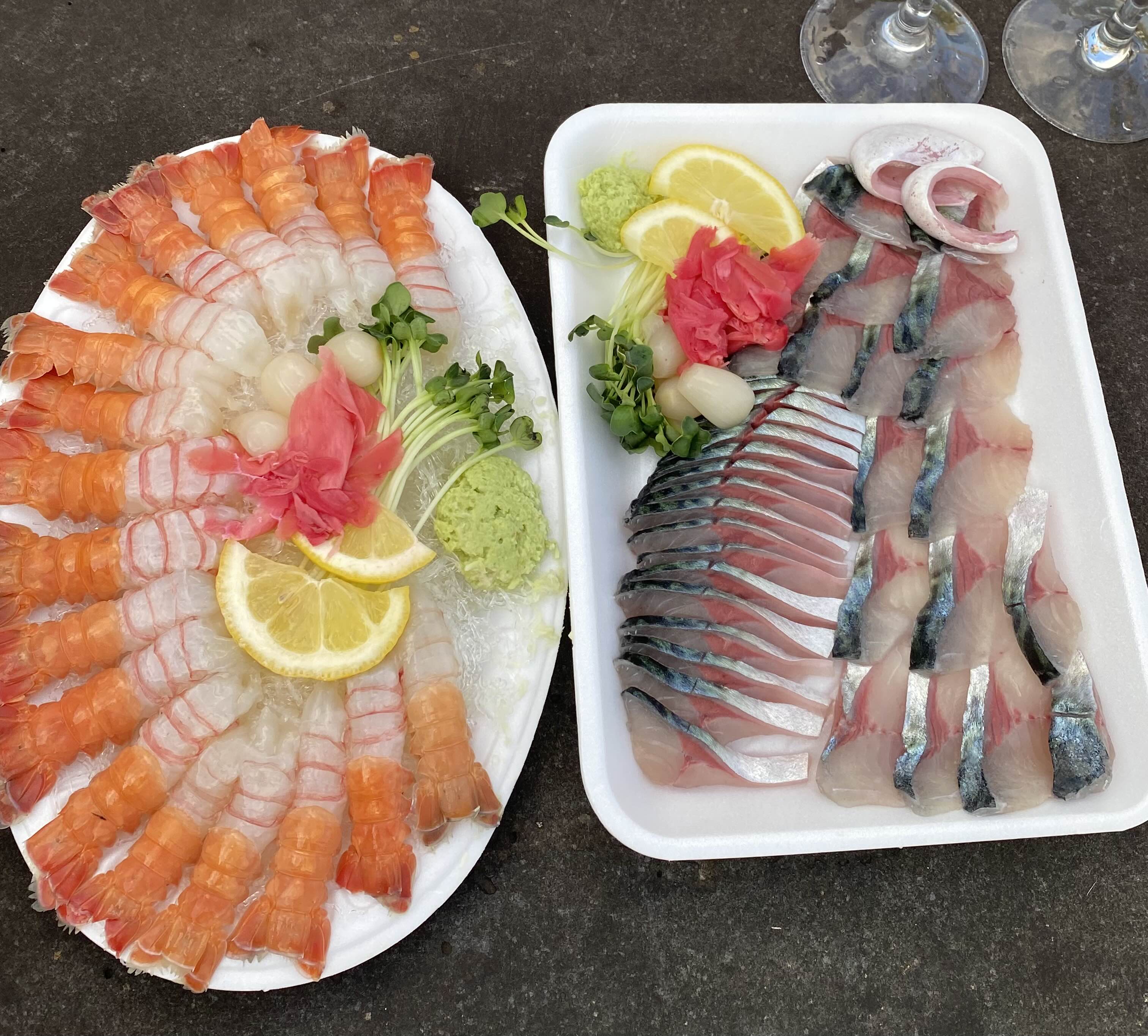 숙소 바로 앞에 밖에서 먹을 수 있는 테이블 공간이 있는데 여기서 먹으려고 고등어회, 딱새우 포장해 왔습니다.